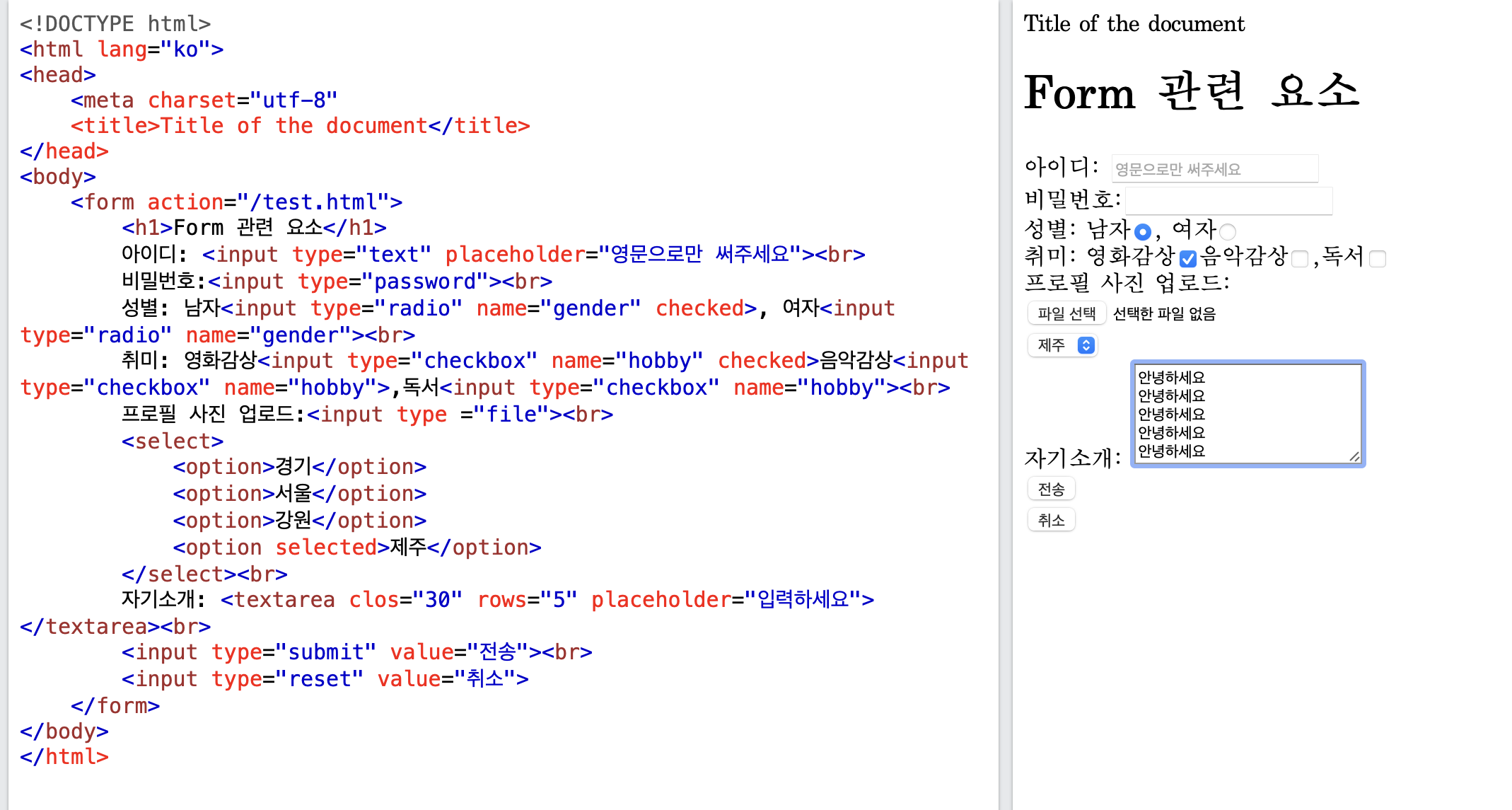 폼 관련 요소: 사용자로부터 데이터를 받아야 하는 경우 사용되는 요소